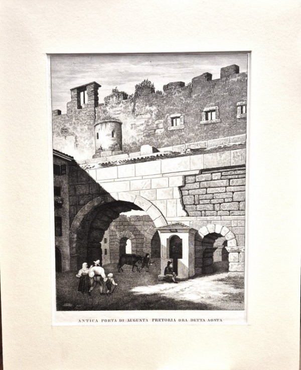 Incisione originale finemente eseguita su matrice di rame. Titolo posto al centro del margine inferiore. L'immagine in esame è una veduta prospettica dell' Arco di Augusto nella città di Aosta con animazione di personaggi in primo piano.Tavola tratta da una delle più importanti e monumentali opere a carattere vedutistico del secolo XIX, ideata da Zuccagni Orlandini, geografo e statistico che dopo aver viaggiato in Europa si stabilì a Firenze ove compose importanti opere geografiche. Registrato all'anagrafe come Giuseppe Orlandini, cambiò la sua identità in Attilio Zuccagni-Orlandini, in memoria dello zio materno, il botanico Attilio Zuccagni, di cui divenne erede. Tuttavia, diventato capo della sezione statistica del Ministero delle Finanze e riprendendo la passione emersa durante i suoi viaggi giovanili, si dedicò presto allo studio della cartografia e della geografia. In questo contesto cominciò i suoi lavori più noti e complessi, quali le compilazioni monumentali relative alla corografia fisico-storica-statistica d'Italia, che interessò il periodo dal 1833 al 1845.Esemplare in buone condizioni conservative.