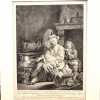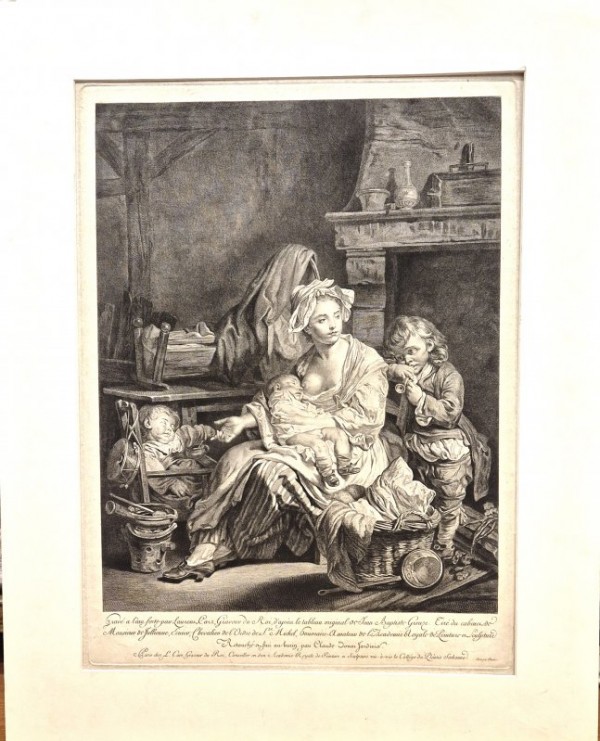 Incisione originale su matrice di rame all' acquaforte. Al margine inferiore indicazione degli autori, legenda e dati editoriali. Tavola ispirata a dipinto di Greuze, artista di grande importanza nel panorama artistico francese del secolo XVIII, conosciuto per il grande ardore e la forte drammaticità espressa nelle sue opere. La traduzione in lastra, eseguita con abile e fine tratteggio, spetta a Cars, incisore francese, graveur du roi, allievo di Tardieu, egli contribuì a orientare l'arte dell' incisione verso effetti più animati e luminosi, incise opere di Lemoisne, Watteau, Chardin, Boucher e , come per il foglio in esame, di Greuze, fu anche ottimo ritrattista. Cars è stato uno dei piu stimati incisori del XVIII secolo , i suoi disegni sono precisi ed il suo tratto modellante ed espressivo. La tavola è stata rifinita a bulino per mano di Jardinier, incisore francese allievo di Dupuis e Le Bas e stretto collaboratore di Cars e Greuze. Suggestiva ed animata scena famigliare, ambientata all'interno di una casa rurale, raffigurante la mamma che tiene tra le braccia il nuovo nato, accanto a lei altri due figli , a sottolineare la scena l'autore ha conferito , come era sua abitudine, chiari e forti segni espressivi ai volti degli astanti. Esemplare in buone condizioni conservative.