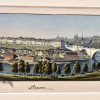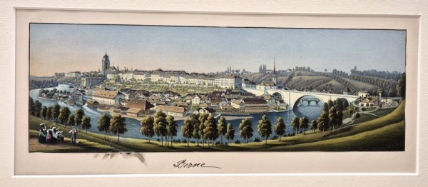 Incisione originale eseguita all'acquatinta impressa a piu colori e vivacemente ritoccata all'acquerello e tempera d'epoca con rialzi "à la gomme" a conferire maggiore contrasto fra chiari e scuri. Elegante e dettagliata veduta della città di Berna con gruppo di personaggi in costume d'epoca in basso a sinistra e titolo manoscritto al centro fuori tavola. Delicata e raffinata coloritura. Esemplare in ottimo stato conservativo.