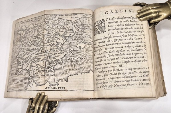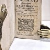 Legatura coeva in piena pergamena rigida, dorso a tre nervi con punti allumati alle cerniere, tagli inferiori con nome dell'autore manoscritto. (182)- 606-(192) pagine numerate, 8 tavole silografate a piena pagina di cui 2 f.t ripiegate raffiguranti la Spagna e la Francia, nella prima parte del testo; altre piccole illustrazioni silografiche lungo il testo raffiguranti scene belliche. Margine del frontespizio ricostruito su tutti e quattro i lati per circa 1 cm. Capilettera silografati e alcuni abitati. Le illustrazioni sono basate sull'edizione di Aldo del 1515. Edizione fra le più complete, con il "De Bello Hispanico e Alessandrino" che mancano in molte edizioni, il testo include la maggior parte dei lavori filologici realizzati sull'opera di Giulio Cesare. Esemplare in discreto stato di conservazione, alcune pagine con margini ricostruti compreso il frontespizio. Diffuse ossiodazioni e gore d'acqua su qualche carta.