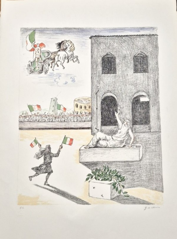 Litografia originale a tre colori impressa su cartoncino con firma autografa in basso a destra, numerazione P.A. (prova d'artista) e timbro a secco, G.De Chirico, in basso a sinistra. Uno dei 5 esemplari in prova d'artista, le altre tirature prevedevano 99 esemplari numerati, 1/99 e 15 esemplari numerati da I a XV. Cfr. Edizioni Bora - Giorgio De Chirico Catalogo dell'Opera Grafica pp. 156-157: " De Chirico in questa scena riutilizza la ormai storicizzata nomenclatura metafisica per celebrare il Centenario dell'Italia Unita. Così la Torre rossa (1913) s'accosta al Colosseo, la bambina che corre in Mistero e malinconia di una strada (1914) sostituisce al cerchio le bandierine tricolori e le consuete bandiere che nella Piazza d'Italia garrivano al vento qui sono agitate da una folla festante, che come siepe umana chiude il fondo, laddove solitamente passava il treno sbuffante fumo. Lo scenario è privo delle fughe prospettiche che nelle Piazze d'Italia scorciavano le case (qui, infatti, nonostante si tratti di una Piazza d'Italia per eccellenza, la casa è vista frontalmente) ed Arianna addirittura si solleva sul suo piedistallo per salutare con la destra la statuaria figura che, stando ritta su un cerchio che attraversa il cielo come il carro di Febo Apollo, dio del sole, regge il tricolore. In primo piano è un parallelepipedo (lo stesso su cui stava seduta una delle Muse inquietanti?). Su di esso è adagiato un ramo di alloro, noto nell'antichità come laurus. Pianta sempreverde, il lauro era consacrato ad Apollo e rappresentava l'immortalità acquisita per mezzo della vittoria, ma era anche il simbolo della saggezza unita all'eroismo. Pertanto, posto sullo squadrato blocco di marmo, materiale geologico fondamentale per innalzare monumenti, del quale l'Italia è ricca, come lo è di monumenti d'arte, allude all'immortalità e alla saggezza dell'Italia, in questa guisa laureata dal genio di de Chirico." Esemplare in eccellente stato di conservazione, piccola stropicciatura all'angolo inferiore destro, freschissimo nell'impressione. L'opera è accompagnata da certificato di autenticità dello stampatore Alberto Caprini che la cita come "parte della collezione privata dello stampatore e archivio della Stamperia Caprini e ne garantisco l'autenticità".