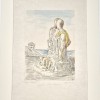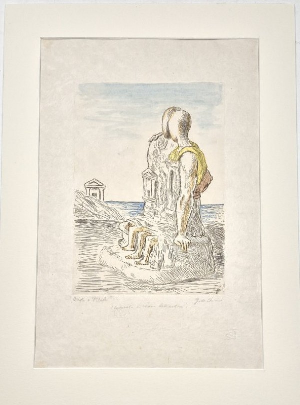 Incisione originale eseguita all'acquaforte e bulino impressa su carta Japon con impressione a secco del timbro dell'editore Caprini; "colorata a mano dall'artista". In basso a destra firma autografa dell'autore, a sinistra titolo "Oreste e Pilade" a matita, in basso al centro "colorata a mano dell'artista" di pugno di De Chirico e timbro a secco sottostante "G.De Chirico". Tiratura senza numerazione, quelle previste furono: alcune prove d'artista, 60 esemplari numerati da 1 a 60, 10 esemplari in Japon numerati I-X , tutte stampate dall'editore G. Upiglio di MIlano, mentre l'esemplare in esame, eccezionalmente colorato da De Chirico stesso, fu stampato con lo stesso rame dal suo editore Caprini, di cui si allega dichiarazione di autenticità sia della stampa che della coloritura e facente parte della sua collezione privata e dell'archivio della Stamperia Caprini. Esemplare in ottimo stato di conservazione, in barbe, piccolo segno di piegatura all'angolo superiore destro.