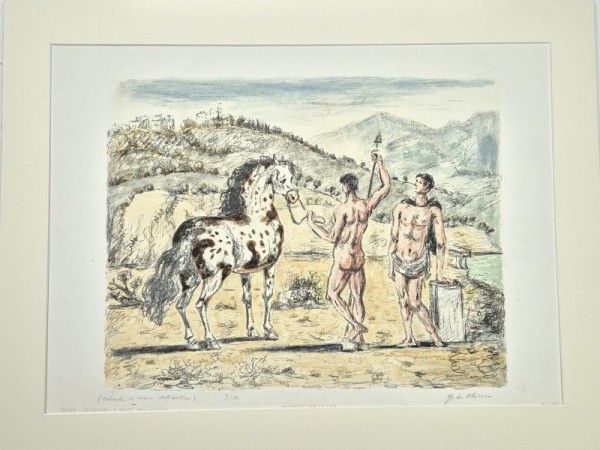 Litografia originale a 8 colori impressa su cartoncino eccezionalmente colorata a mano dal medesimo De Chirico; in basso a destra firma autografa a matita; in basso a sinistra tiratura P.d.A (prova d'artista) e dicitura autografa "colorata a mano dall'autore" e timbro a secco G.de.C. sotto G.de Chirico. La tiratura prevedeva 90 esemplari numerati, 1/90 e 15 esemplari numerati da I a XV ; 15 Prove d'artista, alcuni esemplari colorati a mano da De Chirico, come nel nostro caso. L'opera accompagnata dal certificato di autenticità rilasciata dall'editore A. Caprini che dichiara essere "una litografia d'arte da me stampata, colorata a mano dall'artista, facente parte della collezione privata dello stampatore archivio della Stamperia Caprini". Esemplare in ottimo stato di conservazione e dalla bellissima coloritura.