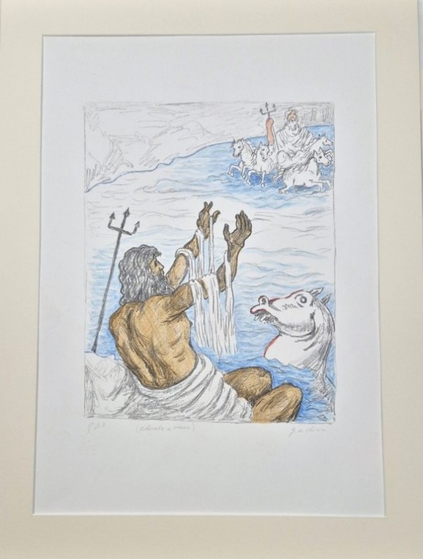 Litografia originale eccezionalmente colorata a mano dal De Chirico medesimo; in basso a destra firma autografa a matita; in basso a sinistra tiratura P.d.A (prova d'artista) e dicitura autografa "colorata a mano dall'autore" e timbro a secco G.de.C., sotto G.de Chirico; all'angolo destro timbro a secco dell'editore Caprini. La tiratura prevedeva 99 esemplari numerati 1/99 e 20 esemplari numerati da I a XX ; 20 esemplari su carta China su Japon numerati I - XX; 21 esemplari siglati dalle lettere da A-Z: alcune prove d'artista, alcuni esemplari colorati a mano da De Chirico, come nel nostro caso. L'opera è accompagnata dal certificato di autenticità rilasciata dall'editore A. Caprini che dichiara essere "una litografia d'arte da me stampata, colorata a mano dall'artista, facente parte della collezione privata dello stampatore archivio della Stamperia Caprini". Esemplare in ottimo stato di conservazione e dalla brillante coloritura.