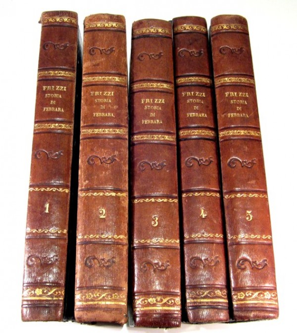Legatura originale in mezza pelle e carta maculata; al dorso, autore, titolo, numero di tomo e fregi in oro e a secco. Volume I: antiporta con ritratto dell'autore entro occhiello e iscrizione sottostante; XIX pagine numerate, bianco il verso dell'ultima, compresi occhiello e frontespizio; 349 pagine numerate, l'ultima con verso bianco; 2 pagine non numerate di indici; 2 carte geografiche numerate incise e ripiegate; 10 tavole numerate, incise e ripiegate, posizionate in ordine progressivo. II volume: X pagine numerate, compresi occhiello e frontespizio; 77 pagine numerate per Capitolo I; 44 pagine numerate per Appendice Quarta; da pagina 79 a 442 pagine numerate, da pagina 311: Saggio di una bibliografia storica ferrarese compilato dal canonico Giuseppe Antonelli; 1 tavola fuori testo incisa e ripiegata. Volume III: VI pagine numerate, compresi occhiello e frontespizio; 522 pagine numerate; 1 albero genealogico inciso e pi� volte ripiegato. Volume IV: VI pagine numerate, compresi occhiello e frontespizio; 451 pagine numerate, bianco il verso dell'ultima; da 501 a 504 pagine numerate, manca tutto il capitolo degli Statuti di Ferrara; 2 pagine non numerate di Indici, l'ultima bianca; 1 albero genealogico inciso e ripiegato. Volume V: XVIII pagine numerate compresi occhiello e frontespizio; 490 pagine numerate; 2 pagine non numerate per Indicazione dei Luoghi; 1 tavola fuori testo incisa raffigurante due statue di Ercole( non ritrovata in altri esemplari conosciuti, n� citata in indice delle tavole); a pagina 243, 2 grandi tavole incise e pi� volte ripiegate con pianta antica e moderna della citt� di Ferrara. Esemplare completo delle tavole in indice, collocate diversamente da come indicato e con una tavola in pi�; oltre alla mancanza del capitolo sugli Statuti, l'esemplare presenta alcune sporadiche fioriture, dovute al tipo di carta, altrimenti un buon esemplare.