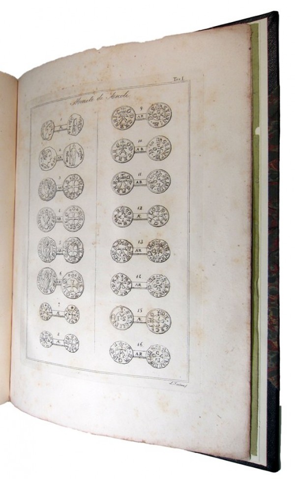 Legatura novecentesca in mezza pelle con punte e carta marmorizzata, titolo e fregi in oro al dorso; all'interno, brossura editoriale salvaguardata con titolo breve entro cornice tipografica al piatto anteriore, che presenta una dedica manoscritta dell'autore al rettore del Seminario Bernardino Mascaretti, dati tipografici al piatto posteriore. Frontespizio con titolo e moneta effigiata, 6 pagine non numerate, 72 pagine numerate, 2 tavole fuori testo raffiguranti numerose monete, 1 carta bianca. Raro testo numismatico sulle monete di Ascoli nelle Marche, dall'epoca romana a quella di Papa Pio VI, fino al 1799. Bell'esemplare a pieni margini, da met� volume, traccia di piegatura centrale, preesistente alla legatura.