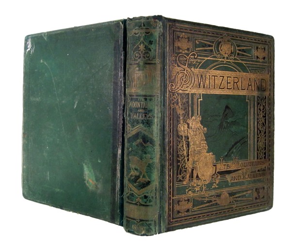 Legatura originale in percallina verde, decorazioni e immagini impresse in oro al piatto anteriore e sul dorso. 487 pagine numerate e numerose immagini incise a silografia, alcune delle quali a piena pagina fuori testo. Prima edizione di quest'opera che descrive le Alpi svizzere, corredata da un significativo apparato iconografico. Esemplare in modeste condizioni, tracce d'usura alla legatura, dorso e cerniere restaurate, ossidazioni ad alcune carte.