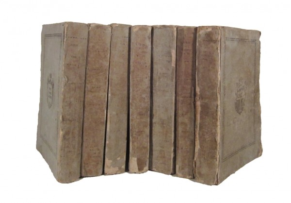 Legatura editoriale in cartoncino azzurro. Ai piatti stemma araldico della città di Verona entro cornice ornamentale entrambi silografati. L (2), 380; 601; 394; 349; 439; 451; 291, CXV pagine numerate. All'antiporta del primo volume ritratto dell'autore inciso all'acquaforte da Giuseppe Dall'Acqua. Interessante e rara storia della città di Verona scritta da Alessandro Carli, storico e letterato veronese proprietario, dal 1789, del celebre Palazzo Carli in Verona. "Rarissimo", secondo il Lozzi. Macchiette rosse al frontespizio e alle pagine 8 e 9 del tomo II, gora d'acqua alle ultime 50 pagine del tomo IV, foro di tarlo alle prime 50 pagine del tomo VII senza intaccarne il testo, tracce d'usura sulle legature; per il resto bell'esemplare, interno fresco e in barbe.