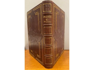 Bella legatura coeva in piena pelle bleu; ai piatti, dal fitto motivo a losanghe impresso a secco, riquadro di duplice diletto e a rotella, e all'interno del riquadro cornice con ricchi fregi agli angoli, il tutto in oro; dorso con due tasselli rossi, evidenziati da fregi, recante titolo e...