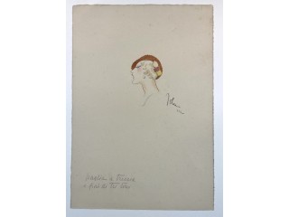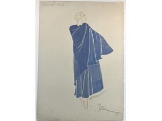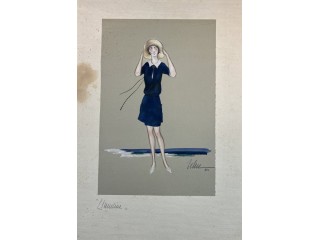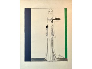 Original watercolor on cardboard representing fashion model, author's signature and date in pencil at the bottom right. The work is up to help John, an American mother Italian dress designer, active mainly in the fashion scene in Turin in the first half of the twentieth century. Its tables are...